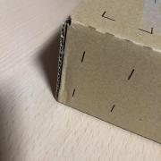 大きく凹んでいるわけではないのですが、段ボールの変形が見られます。この程度の衝撃で中身が壊れないようにするためのものですので、たぶん、(大丈夫なんだろう)となにかの教えを信じる感じで次に。