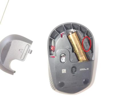 無線マウスなので、付属品としては単三電池とアダプター。アダプターはマウス本体のバッテリー格納箇所に入っています。下記画像赤丸部分にはめ込まれています。