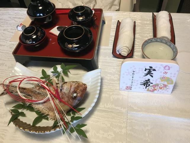 初孫のお食い初めとして、鯛の尾頭付きと4つのお椀が揃います。