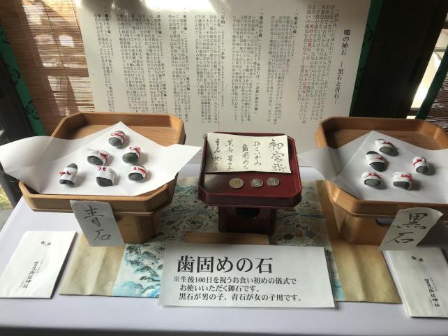 件の「歯固めの石」を交えて、赤飯、吸い物、煮物、鯛の尾頭付き、香のものを