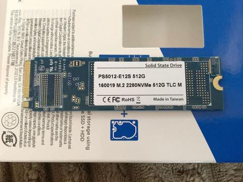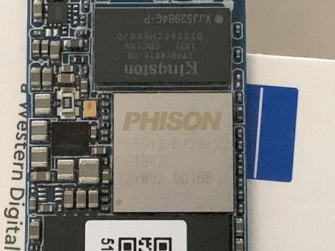 型番ラベルには「PS5012-E12S 512G」と記載されています。PS5012-E12Sはコントローラーの型番ですが、PHISONのデータシートで調べたところ、PHISON自身がリリースしているSSDの完成品もこの型番を与えられているようです。