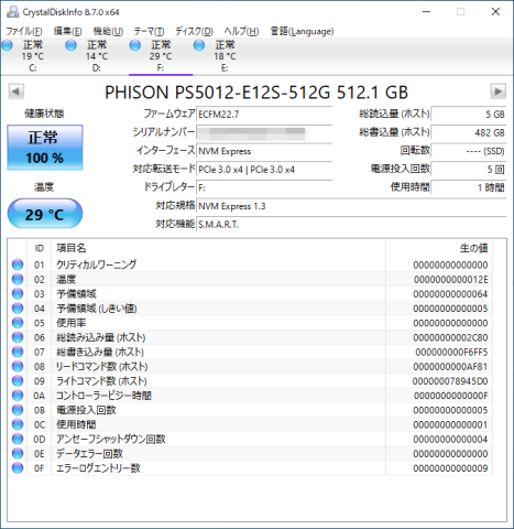 まずはCrystal Disk InfoでS.M.A.R.Tの情報を確認しておきましょう。