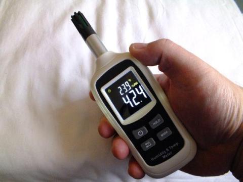手持ちの温湿度を簡易計測できる目覚まし時計で表示される数値に