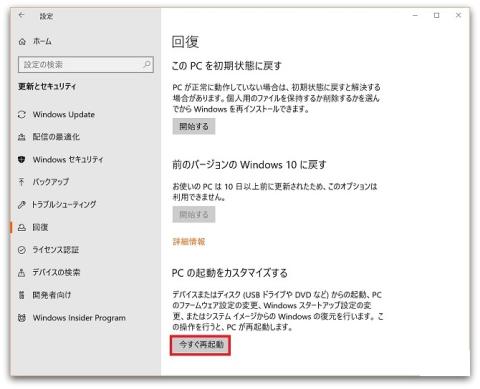 その中に「PCの起動をカスタマイズする」にある「今すぐ再起動」をクリック。