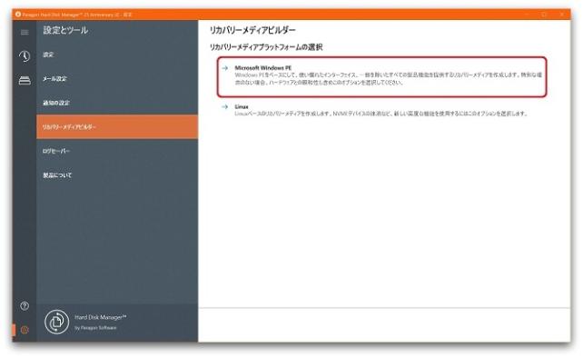 メイン画面の左下の「歯車のボタン」から「設定とツール」を選び、さらに「リカバリーメディアビルダー」を起動する。