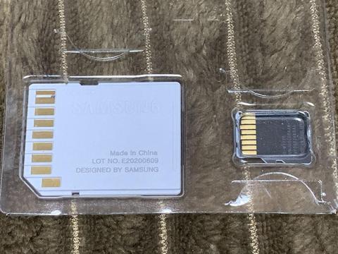 SDアダプターは他のSamsung製microSD製品に同梱されているものと同じように見えます。こちらはメモリーカード本体とは異なり1年保証だそうです。