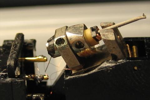 手前側で左CHコイルからの2本の線が、場所不明ですが途中で切れてます 使用しているエナメル線が細くて半田補修は難しいです エナメルを剥がすエナメルリムーバーが欲しいところですがそれほど使わないし、躊躇してます カンチレバーの左側延長線上にある下がっている線はテンションワイヤーでどちらかのマイナスネジで固定してます 画像を拡大して頂くと発電コイルが「逆ハ」上に