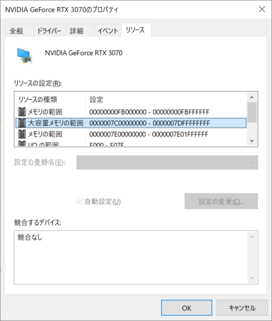 デバイスマネージャからRTX3070のプロパティ -> リソース に "大容量メモリの範囲" というのが表示される様になりました。これが Resizeable-BAR が機能している証拠らしいです。