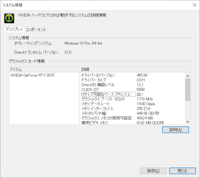 NVIDIAコントロールパネルのシステム情報でも "リサイズ可能なベースアドレス レジスタ はい" になっています。