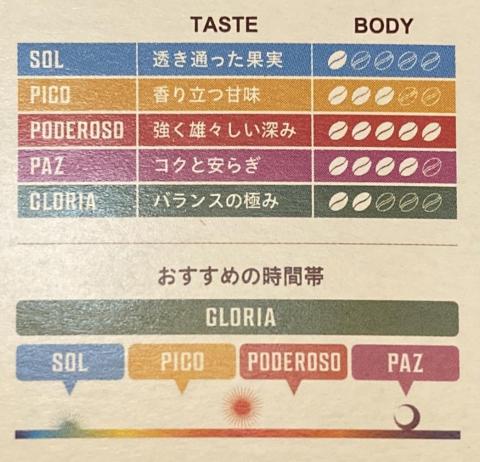 パッケージ横に5種のコーヒーのオススメ時間帯が示されているのでそれに合わせて愉んでみました。