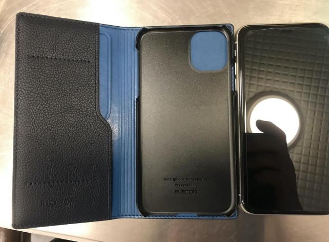 カメラ部の四角いくり抜きの向こうに、スマホカバーそのものが見えます。