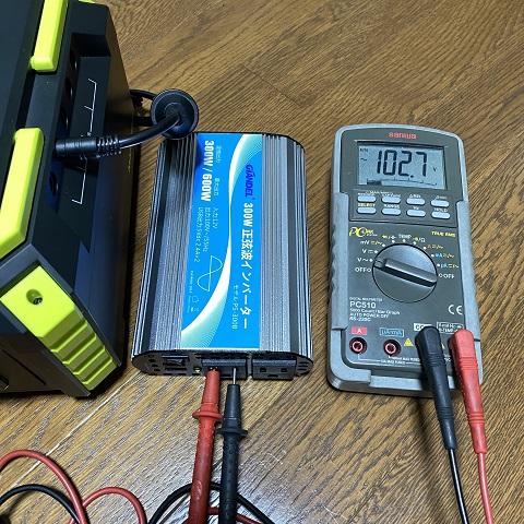 次は、このポータブルバッテリーの12V出力を使い、シガレットケーブルで「正弦波インバーター」の100Vを計ってみた。