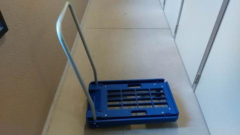 下画像でトランクルームは半畳くらいありますので実際は奥まで入りますが、奥に私物の段ボール箱や車の工具、清掃用具があるので此処までです なんとかギリギリ入りました これからはこの台車を押していけば1往復で済みます モバイルキャリーというのは折り畳めて車で運べる台車の意味のようです 鍵付きのトランクルームは居住者に1個割り当てられていてタイヤ以外の物でもOKです。