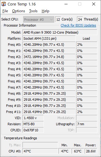 こちらはコアが7個ほど4.3GHz以上で回っていて、結構アグレッシブに周波数を上げてきている印象ですが、それだけに割合短時間のチェックでも最大63℃を記録しています。Ryzen 7 2700では50℃を超えることがあまりなかったことを考えれば、やはり発熱は相応に増えていることがわかります。