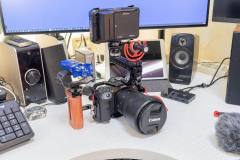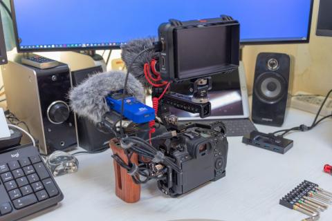 さらにカメラ内蔵マイクではなく、外部マイクを使っていますがモノラルマイクのため別途ステレオの録音機を持参することがありますが、変則的なつけ方をしていました。