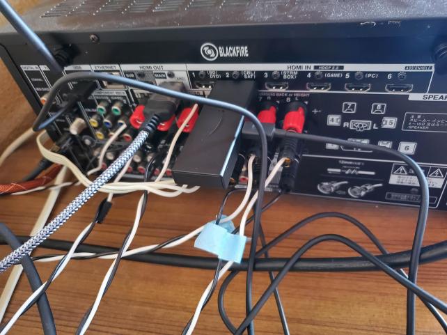 付属の5V 1Aの電源にUSBケーブルでFire TV Stickに給電するのですが、電源コネクタが足りないので、AVアンプから給電しました。