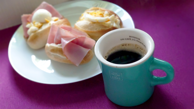 ハムではなくベーコンを入れたのですが旨味のある脂質もジャンボン・ブールのようで良い感じに合います。クラストのバリバリした硬い食感や塩味もコーヒーと溶け合うことで柔らかく味わい深く、シンプルな素材のおかげで豊かな香りのコーヒーを楽しめます。フードもコーヒーも両方とも後味もすっきりしているのでメチャクチャ合います。毎日これでいい。