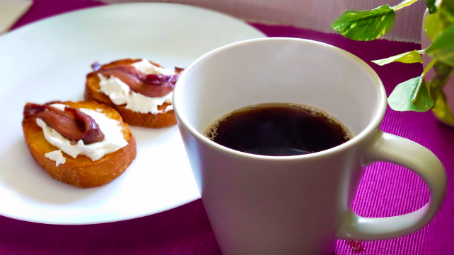 アンチョビとクリームチーズと言えばワインに合うフードですが、チーズとの相性も良く、塩辛くて旨味があるのでコーヒーに合わせると美味しく飲めます。