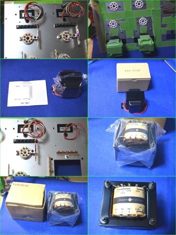 同じ真空管ソケット4個を取り付けます ソケットは陶器なので金属アダプターでネジ二本で取り付けます 金属アダプターでソケットをシャーシーに抑え込む形になります そして配線に使うラグ板を取り付け後、左右の出力トランスを取り付けます トランスは小ぶり?ですね 出力トランス2個取り付けます ラグ板中央部の赤いテープは此処はアースなので誤配線しない為のものです 出力トランスはタップ切替(4Ω、8Ω、16Ω 使うスピーカーで選択)でSP端子にハンダ付け、使わない端子は熱収縮チューブで保存)