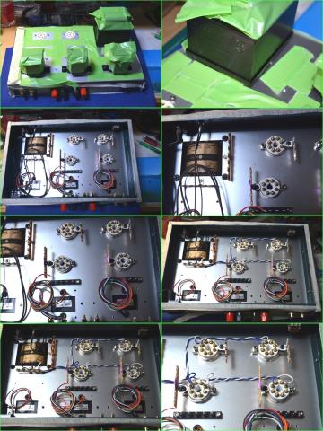 トランス類の養生: 此処は養生テープで行ってください 粘着テープだと塗装がはがれる可能性もあります 電源トランス周囲(コアー部)の養生はしないほうが良いです 塗装が焼き付け塗装でないので剥がれます 私はマジックペンで塗りなおし?ました トランスの上下部など焼き付き塗装で大丈夫です 次に電源トランス回りやパイロットランプ、電源スイッチの配線、ヒーター配線を行います