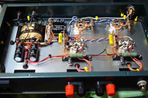 アースは錫メッキ線の空中配線となっていて、電源部付近の配線も混雑してます 大きな抵抗 430Ω 5Wは出力段のカソード抵抗で、黄色いコンデンサーはドライブ/出力段のカップリングコンデンサーでマロリー0.1μF 630Vです 電源電解コンデンサーが総じてエネルギー蓄積的に弱い感じはします