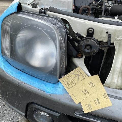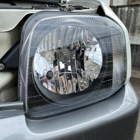 見ての通りジムニー君のヘッドライトは黄ばみが酷い。斜めから見ると特に分かるのです。紫外線のあたらないボンネットで隠れている部分はまともに見えるけど、日の当たる場所はひどい状態です。