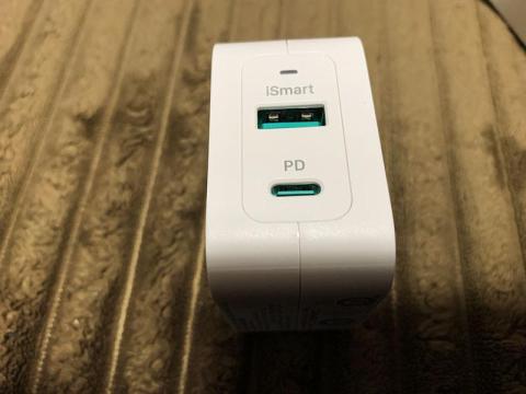 端子はUSB type A、USB type Cが1系統ずつ用意されています。type C側にPD(Power Delivery)、type A側にiSmartと印刷されています。iSmartはRAVPOWERのオリジナル規格で、最大5V 2.4Aまでの機器であっても効率よく短時間で充電するという売り文句となっています。出力の65Wは両端子の合計値ですので、type Cで65W PDを利用する場合にはtype A側を同時使用することは出来ません。