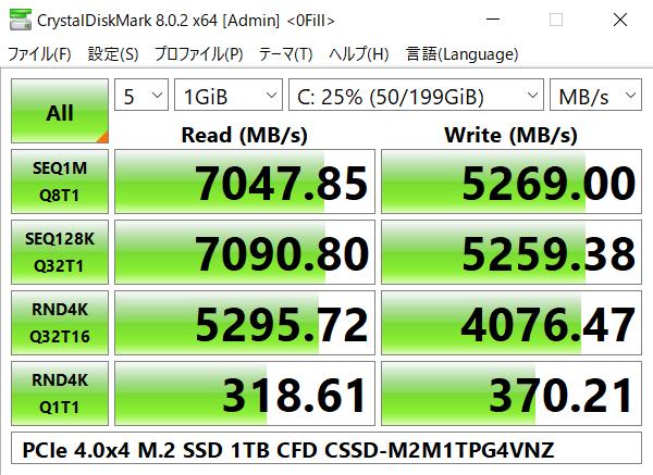 PCIe 4.0 x4スロットに、CFD CSSDM2M1TPG4VNZを入れて、DiskMarkを走らせてみました。