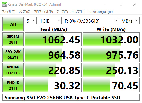 USB接続のポータブルSSDとしては、立派な速度ではないでしょうか。