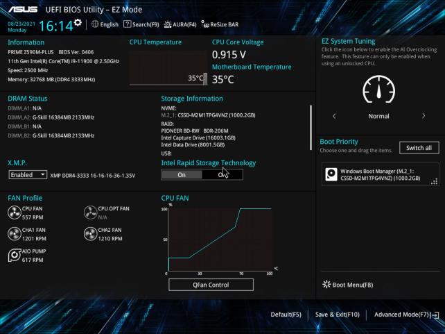 メモリも、無事DDR4-3333として動作し、NVMe 1TB SSD , PIoneer 光学ドライブ, HDD 16TB,8TB(IRST RAID)が認識されています。