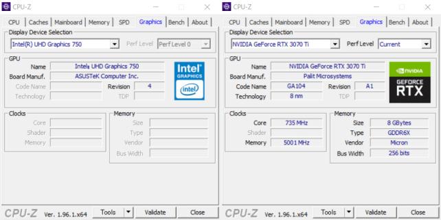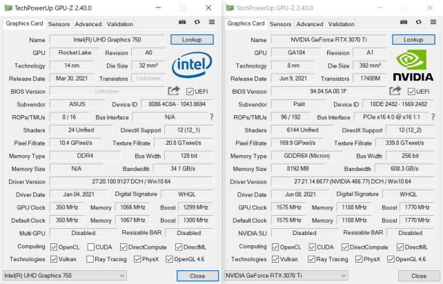 GPU-Zは、CPU内蔵のインテル HDグラフィックス750とnVIDIA GeForceRTX3070Tiです。RTX3070Tiは、PCIe 4.0 x16動作です。
