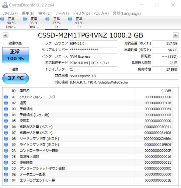 SSDもDiskInfoをみると、PCIe 4.0 x4で動作しています。
