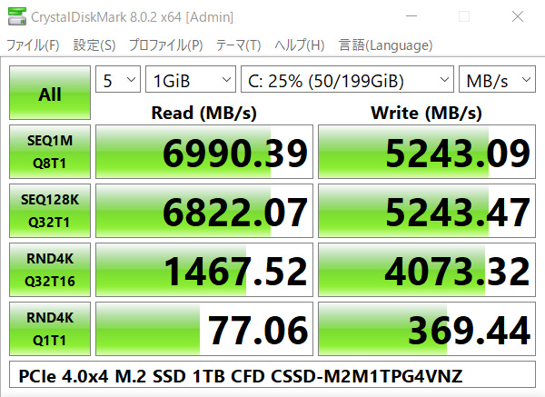DiskMarkでは、ほぼスペック通りで高速です。OSの起動がより速く感じられます。