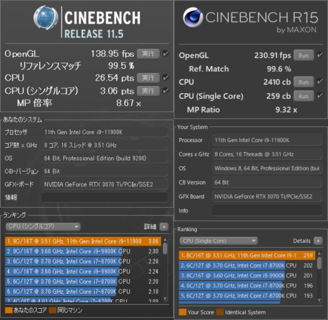 CineBenchのCPUスコアでは、Core i9 9900Kより高速で、順当な進化をしていました。