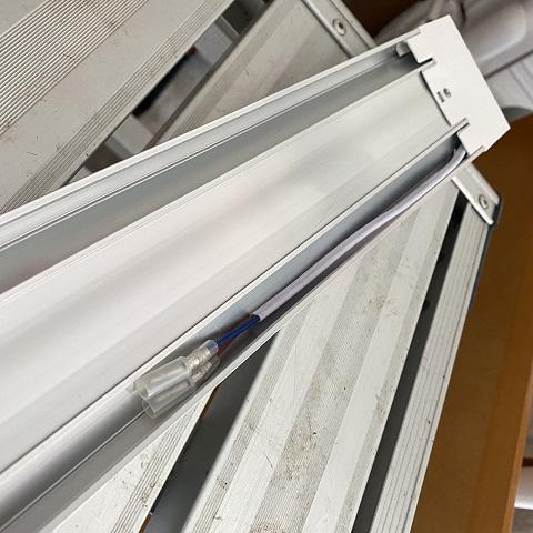 天井から来ているケーブルに2度と外れないようにスリーブで圧着。蛍光灯側は交換が出来るように脱着スリーブにしました。
