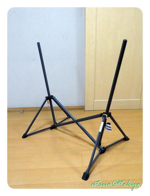 上部に飛び出た支柱(パイプ)を両側に開く事で脚部が広がります。