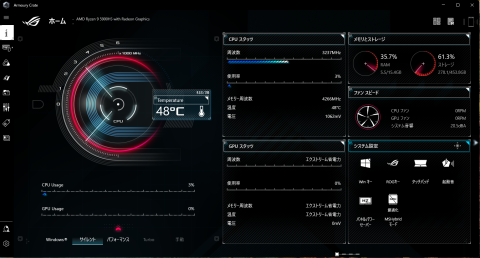 管理アプリのArmoury crateで電源プランの変更、GPUのON/OFFなどの設定変更が行えます。