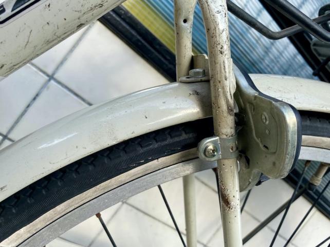 後ろ三角パイプの太さを選ばない薄い軟鉄を、適当に広げてからネジ一本で締め上げる構造。
