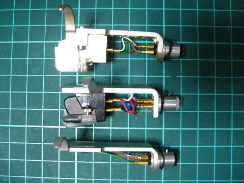普及型ヘッドシェル比較で、上から順に、ピッカーリング、オルトフォン、VESTAX という具合に板の厚みが判ると思います カートリッジは取り付け可能ですがやや貧弱に見えます 上2つが2.3mm