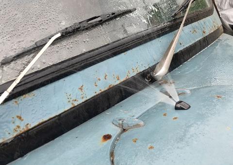 この写真だと随分窓の下…というかワイパーに水をぶっかけているように見えるがその通り。T2000、何故かノズルが窓に近い&窓に向かって下り傾斜の位置にノズルを装着しているので目いっぱい噴射口を上向きにしてもこれ。元々ついてたノズルも限界まで上向きになっていた。
