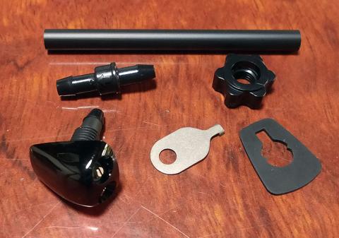 付属品にはワンウェイバルブとノズル~バルブ間のための短い黒いチューブ、そしてワイドノズル専用の調整器具もついているので安心。ちなみにチューブの内径は4mm。上のウォッシャータンク一式も内径4mmだったのでこれが標準なのだろう。
