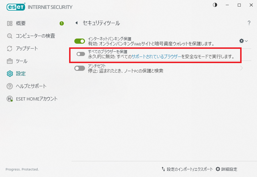 少なくとも自分の環境では、ESETの設定を「全てのブラウザを永久的に無効」としておけば、インターネットバンキングの時だけに限定されて動作してます。