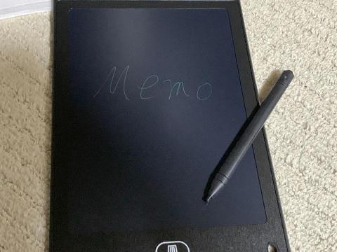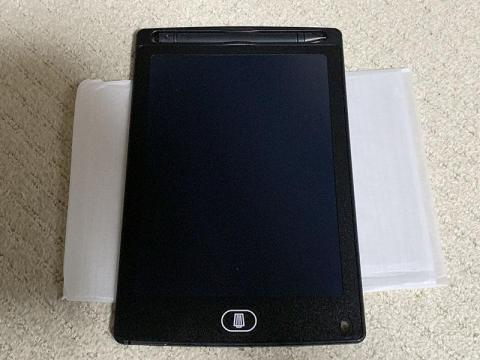 こちらが電子メモパッド本体です。画面上部の溝に専用ペンをはめ込んで固定できるようになっています。また、画面下部にはボタンが一つだけ用意されていますが、これはそれまでに書いた内容を全て消去するためのものです。