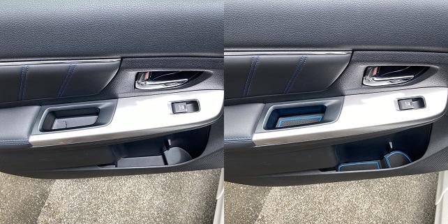 ドアの取っ手もドリンクスペースもブルーで統一。ドアのドリンク置き場はクッション材も無かったので異音もせず安心して置けるようになりました。ドアのスティッチともマッチングー