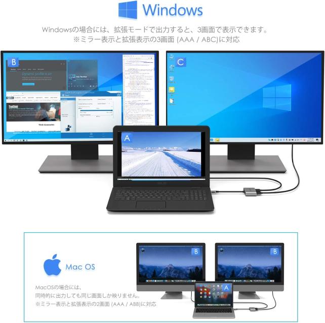 安価な物は、HDMIとDisplay Portがあるけど同じ映像しか出力できないのが多い中、この製品は安いのに別々の映像を出力できます。