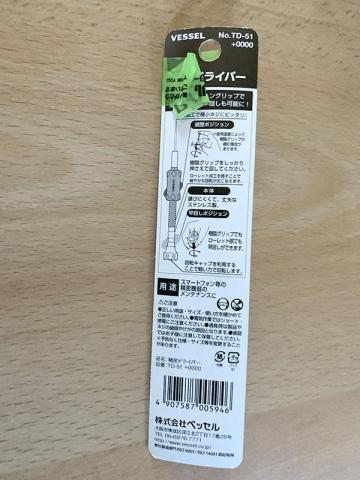 仕方なく、家から徒歩数分の場所にあるホームセンターに出向き、店頭に置いてある中で最も小さいサイズのプラスドライバーを探したところ、該当したのがこちらのVESSEL製No.TD-51 +0000でしたので、これを購入してきました。