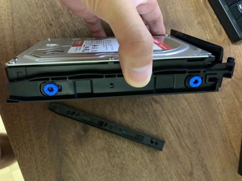 写真だとわかりにくいと思いますが、側面のパーツを外した状態でHDDをトレイに乗せて、