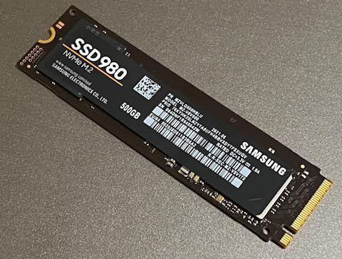 サムスンのSSDです。NVMe(PCIe 3.0x4)インターフェースを採用した980 シリーズの中の500GBタイプです。新調した仕事用ノートパソコンのSSD容量が256GBとちょっと寂しかったので、増設用に購入しました。