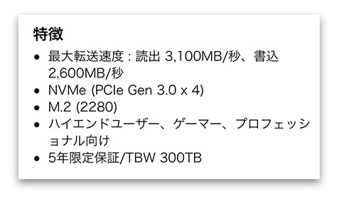 特にブランドに拘りは無かったので、NVMe接続で500GB程度のm.2 2280 SSDでお手頃価格なものを探していました。当初はコレとは別の製品をいくつか候補に挙げていたのですが、品切れだったり、口コミがイマイチだったりしたので、色々悩んでいるウチに気付いたらコレで良いやって事になっていました^_^;