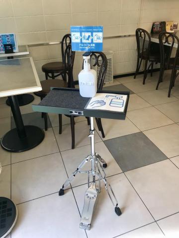 二次接触の危険を減らすために、ドラムのハイハットスタンドを利用したアルコールスプレーボトルスタンドを設置しております。